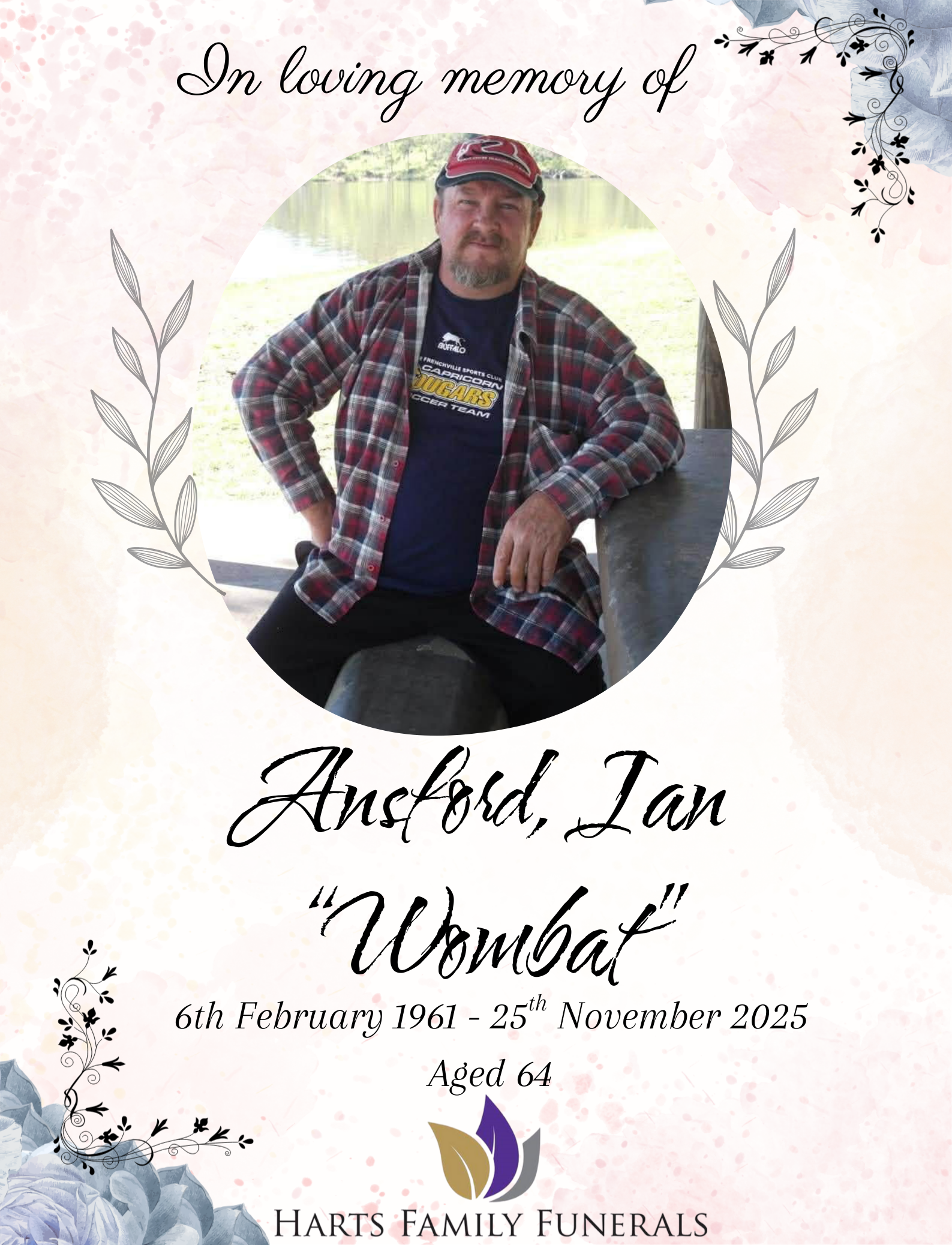 Very loved Brother to George, Stan, Lloyd (deceased), Colin, David, Grace, Keith, Ian, Cheryl and Maurice (deceased).